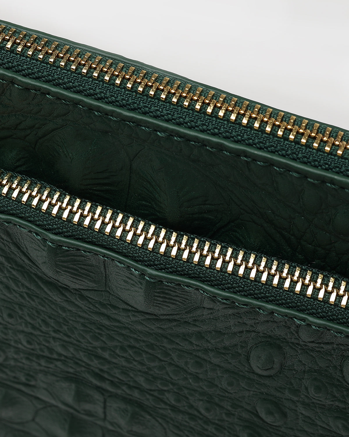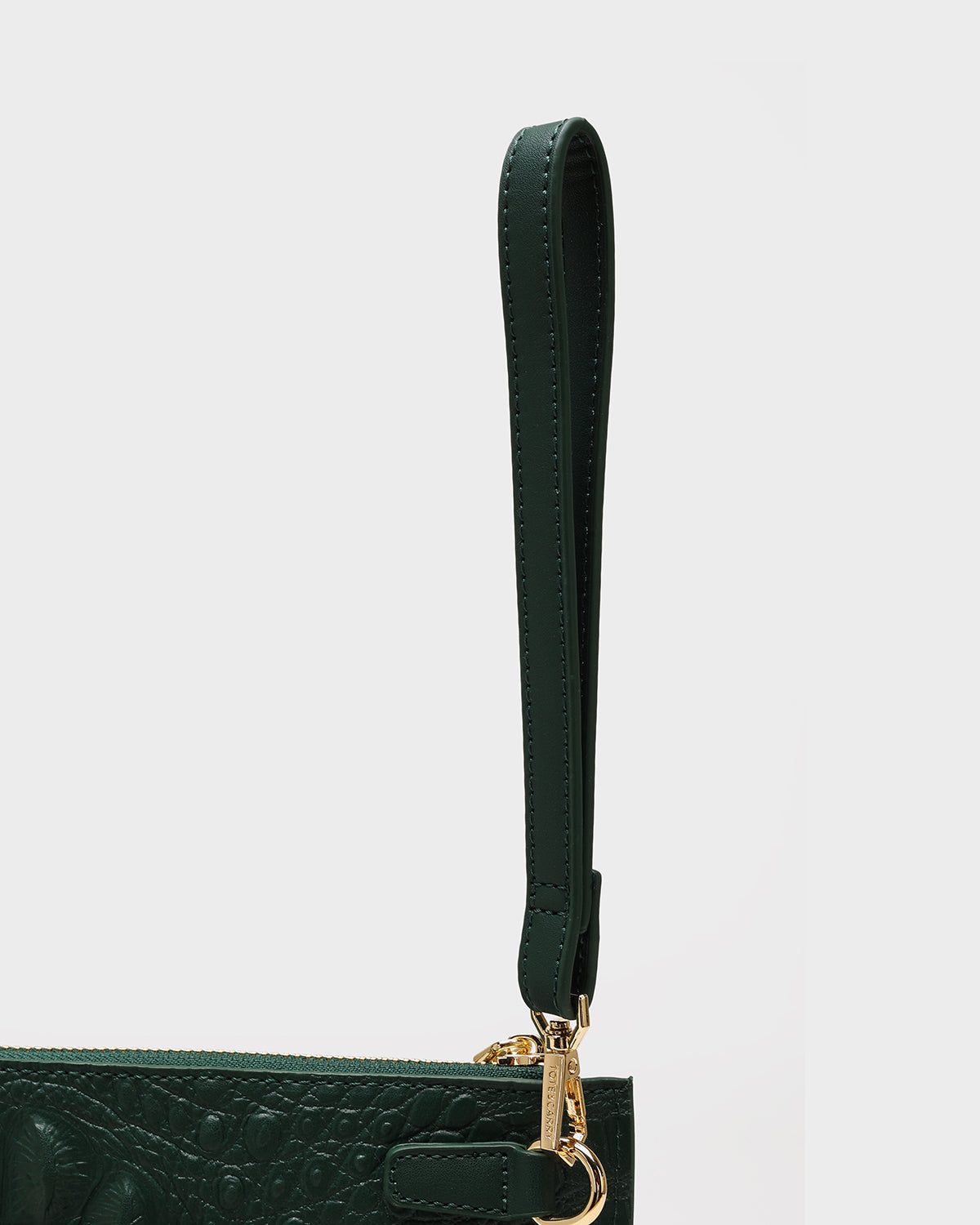 Our new clutch design is decked in our sustainable alligator-grained print but leaves plenty of room for all our infamous bling: heavy gold zippers on a full, outside pocket, a gold T&C collectible charm, and metallic logo-lettering on the haute, hand grip. A secondary, satin lining color on the inside highlights six secure sections for credit cards, and a secret snap compartment for your hidden gems. Our removable handle offers 2-in-1 unmatched style.