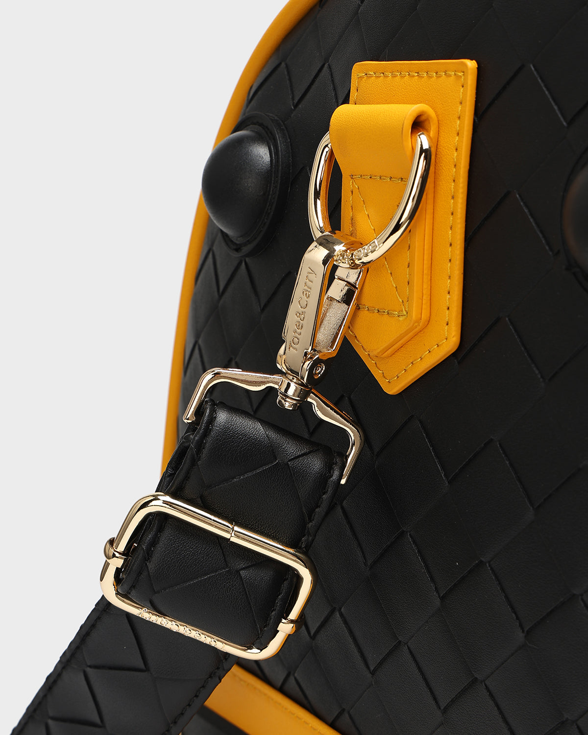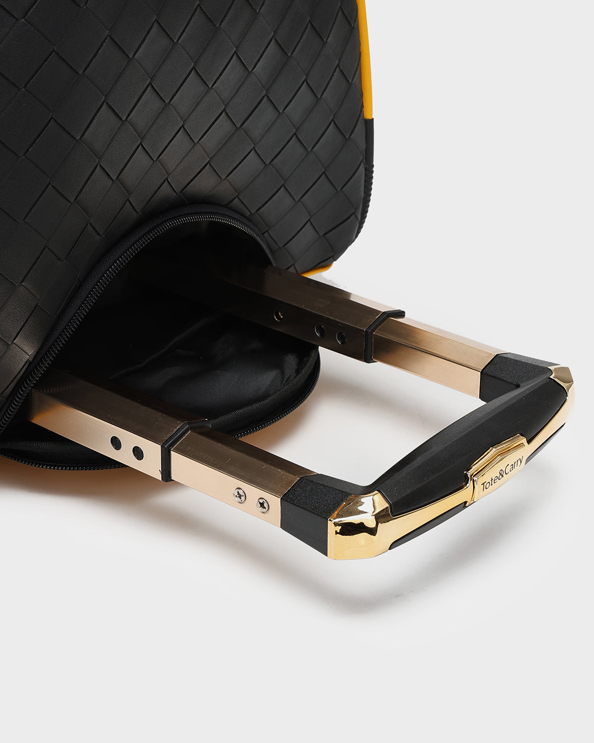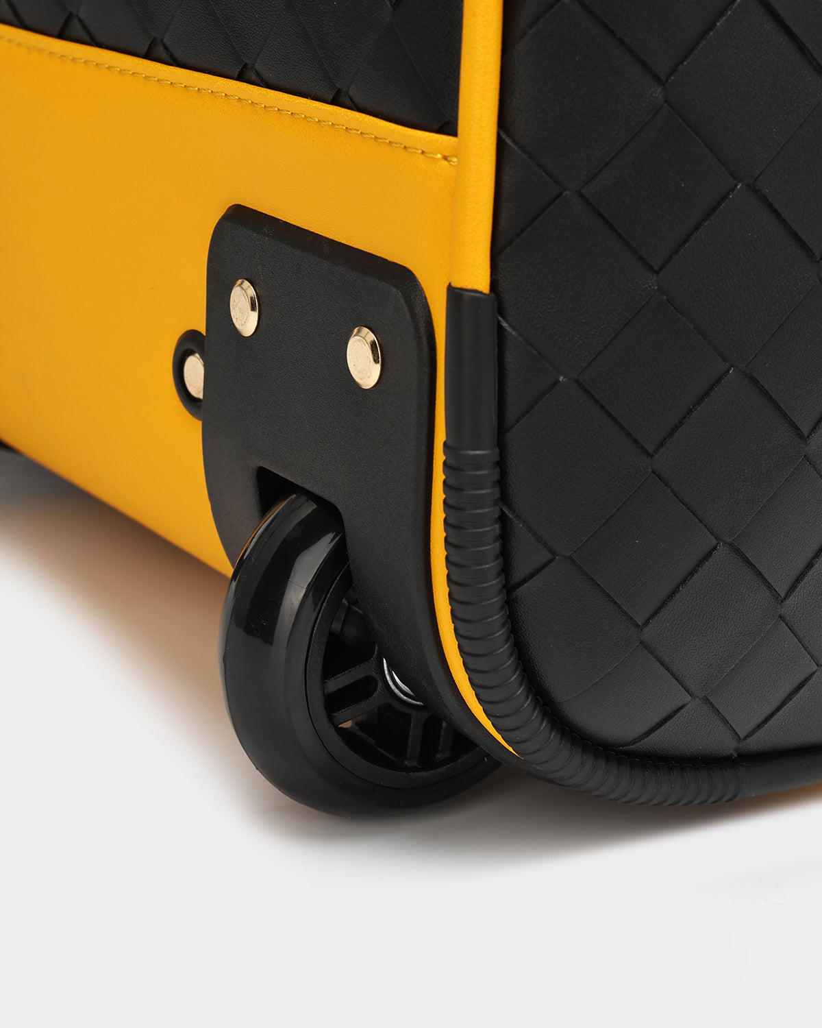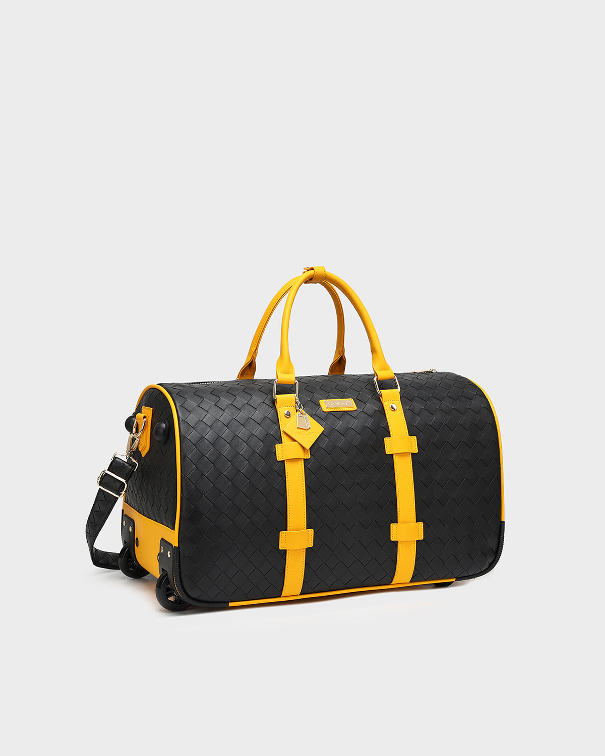 The Ultimate Travel Companion. The Bodega Rolling Duffle Bag in Black & Mustard is the perfect blend of style and functionality. This spacious and durable bag is designed to handle all your travel needs, while making a bold statement with its striking color combination.