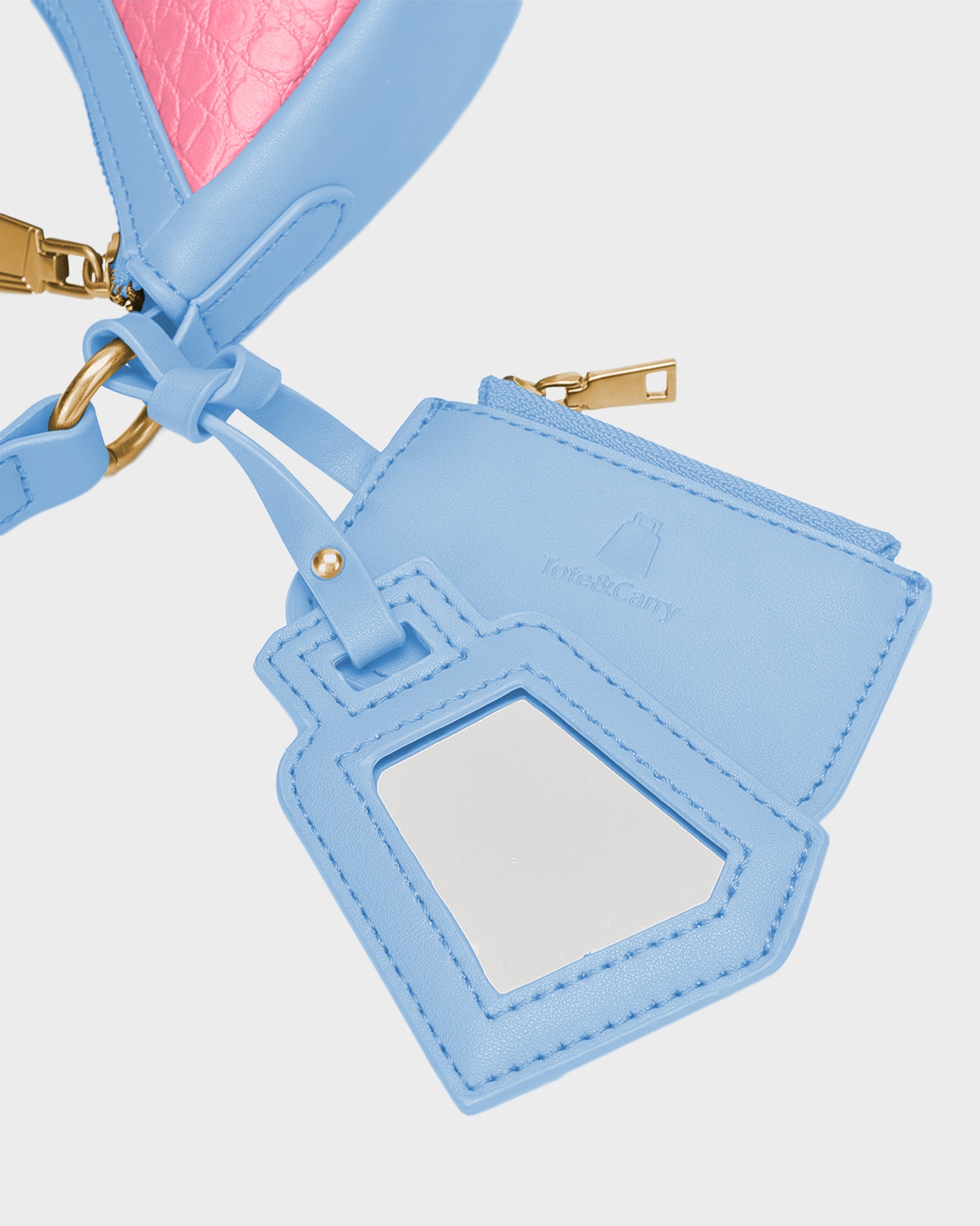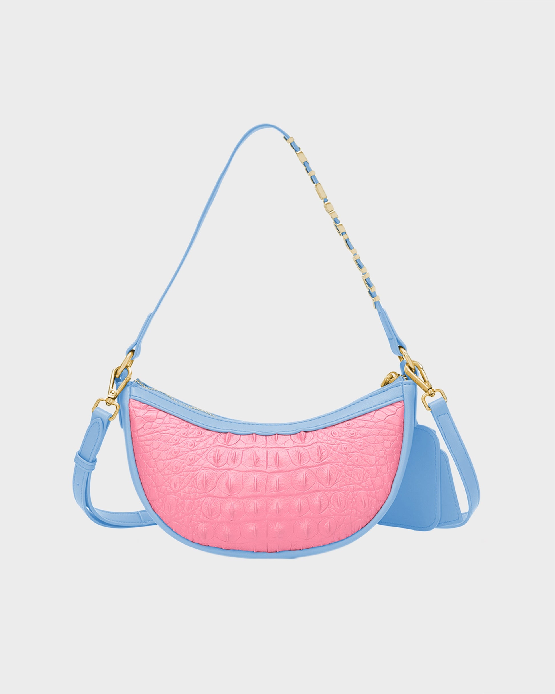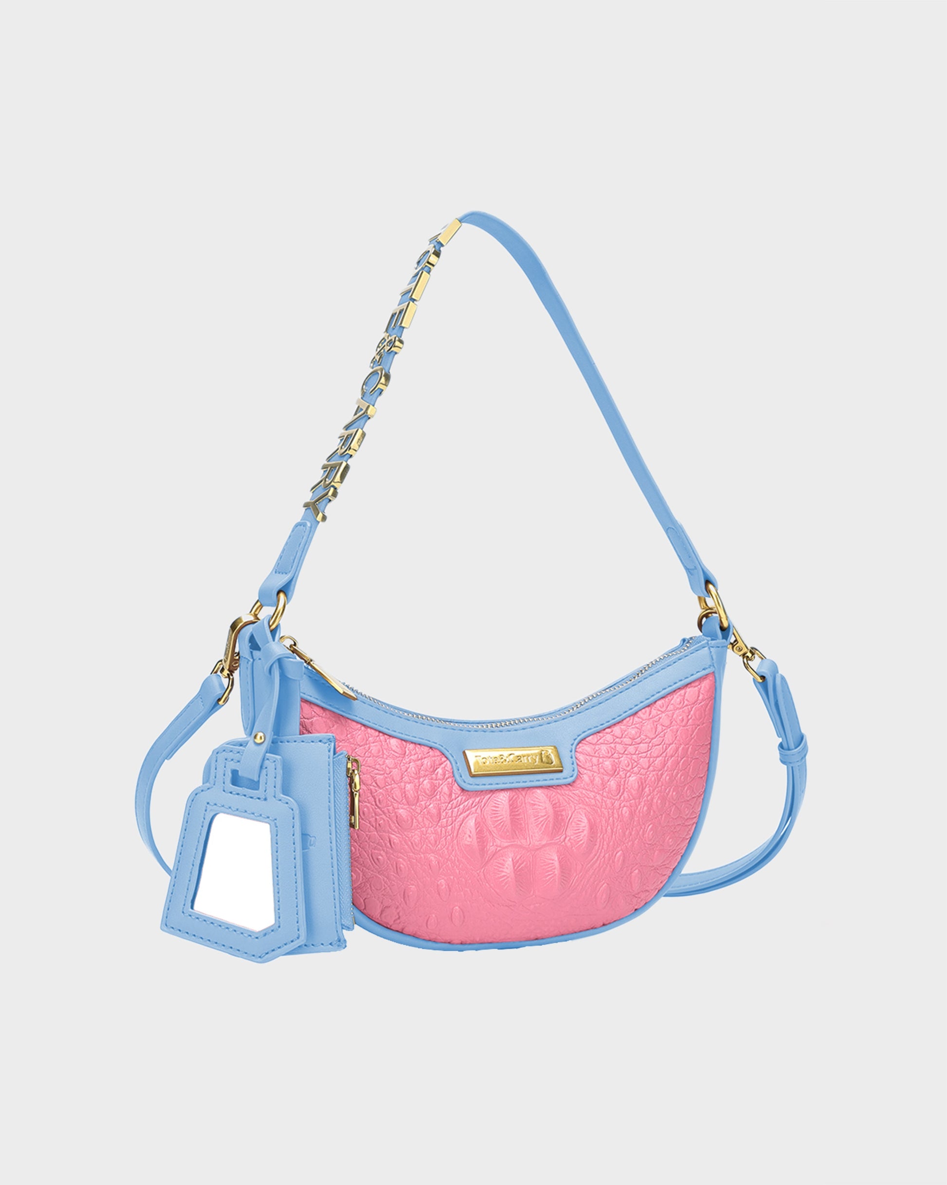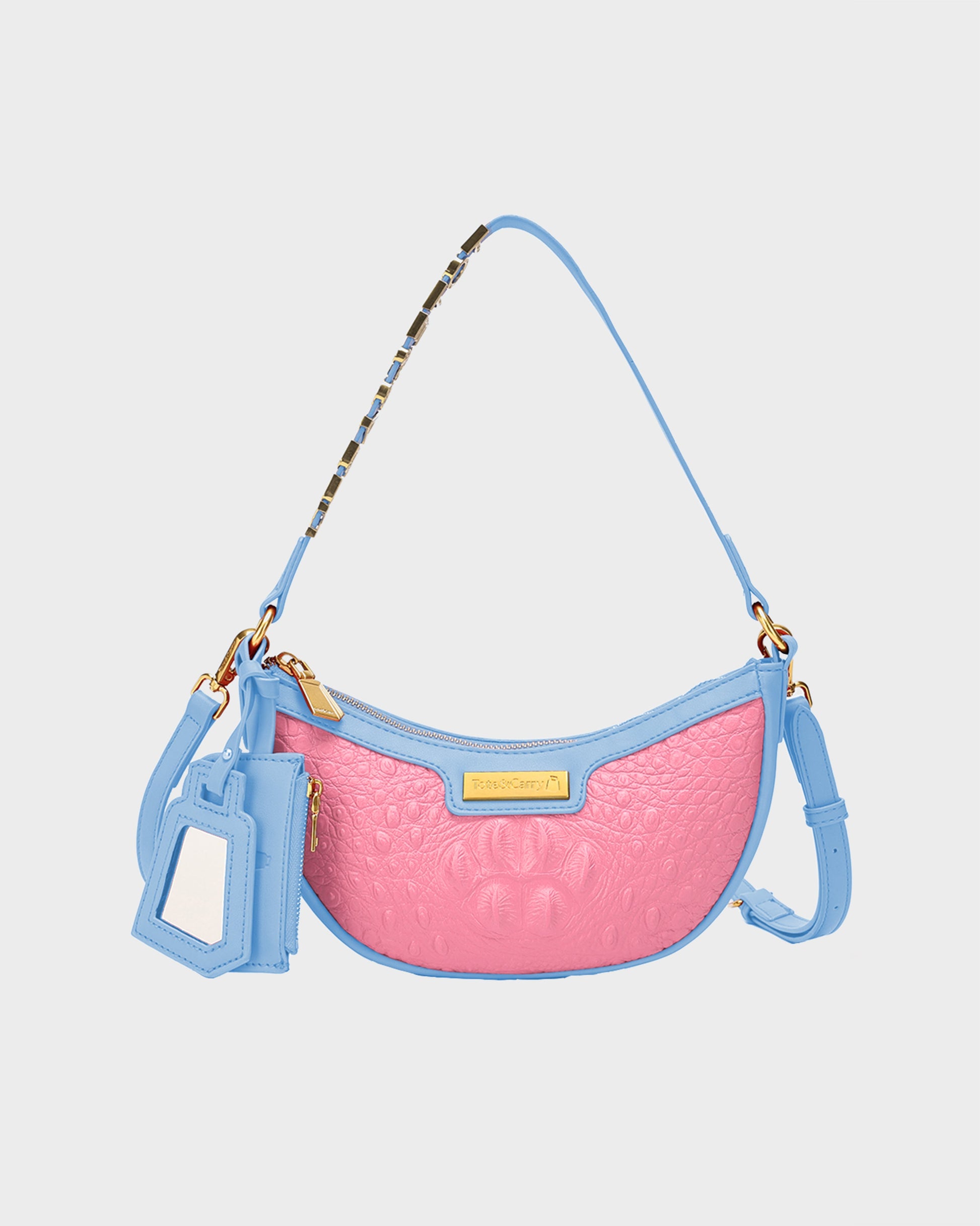 Sweeten your style with the Tote&Carry Cutie Shoulder Purse in a charming Blue & Pink combination! This totally cute crescent bag pairs a vibrant pink crocodile-embossed body with soft sky blue accents on the trim, shoulder strap, and matching mirror tag. It's a playful and unique color pairing that pops with personality! Finished with polished gold-tone hardware, including chic strap detailing and a signature logo plate, this bag adds a delightful dose of fun and fashion to any outfit.