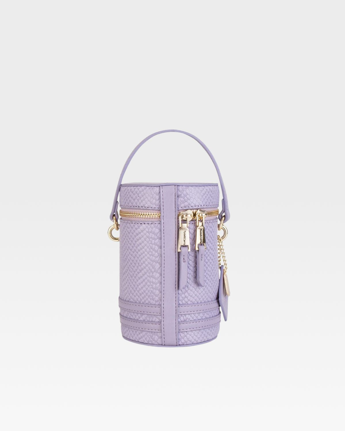 Meet your new favorite statement accessory, the Tote&Carry Mini Barrel Purse in lovely Lavender! This uniquely shaped cutie packs major style into a compact, cylindrical form. Rocking a chic faux snakeskin texture and a soft lavender hue, it's perfect for adding a pop of trendy color and luxurious feel to your look. The distinctive barrel design is fun yet sophisticated, finished with gleaming gold hardware for extra flair. Ideal for keeping essentials close when you're traveling light and turning heads, it’s a must-have mini that embodies fun, functional fashion.