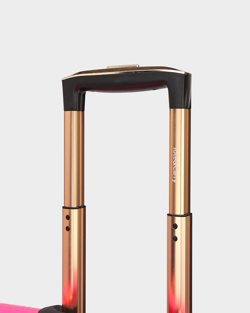 Zipper pouches - front and back adorned with heavy gold hardware - offer on the go convenience. Color-coded cushion handles and a pull-up chrome ?top handle top travel-friendly features.?Smooth-moving, Gold Chrome Wheels outfit you through your next travel adventure.?